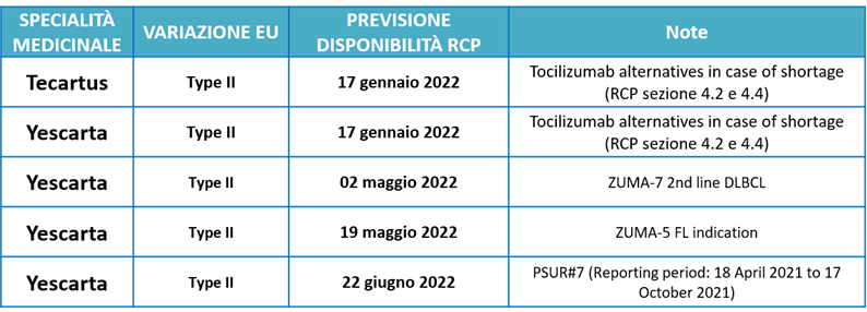 Prodotti GS / Area Kite Kite - Aggiornamento RCP - Gennaio 2022 14 gennaio 2022 GENNAIO 2022 - Aggiornamento delle modifiche previste agli RCP delle specialità medicinali Kite. Tags: variazioni RCP kite Yescarta Tecartus Come giudichi questo contenuto? Utile Non utile Grazie per il tuo feedback!