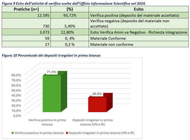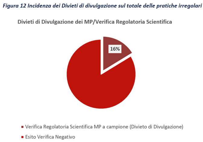 Nel corso dell’anno 2024 sono stati condotti, a campione o sulla base delle deviazioni rilevate già in fase di verifica formale amministrativa, n.142 approfondimenti regolatori e scientifici dei MP. Il 100% di questi approfondimenti ha dato luogo ad un provvedimento di Divieto di Divulgazione. I provvedimenti di Divieto di Divulgazione costituiscono il 16% del totale delle pratiche poste in esito negativo