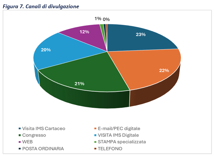 Circa la metà dei materiali promozionali depositati è stata divulgata attraverso la visita dell’informatore scientifico (visita IMS cartaceo 23%; visita IMS digitale 20%), mentre il 35 % viene divulgato attraverso il web (e-mail 22%; web 12%). È rilevante, infine, il numero di MP finalizzato alla divulgazione attraverso i congressi (21%). Più residuali, sotto l’1%, i canali “posta ordinaria”, stampa specializzata e telefono.