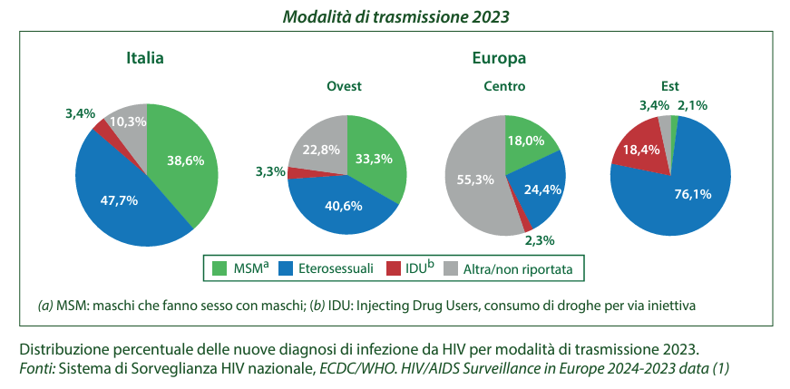- Il numero più elevato di diagnosi è da vari anni attribuibile alla trasmissione sessuale: nell'ordine, a maschi che fanno sesso con maschi (MSM) (38,6%), maschi eterosessuali (26,6%) e femmine eterosessuali (21,1%).