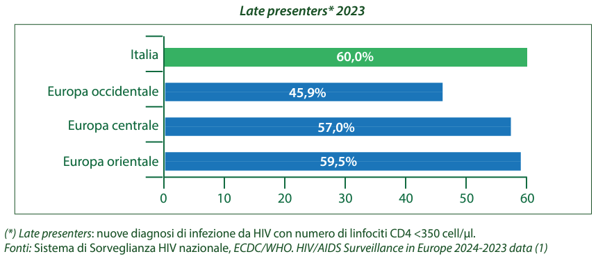 Dal 2015 è in continuo aumento la quota di persone a cui viene diagnosticata tardivamente l’infezione da HIV (con bassi CD4 o in AIDS); nel 2023, due terzi degli eterosessuali, sia maschi che femmine, e più della metà degli MSM sono stati diagnosticati con CD4<350 cell/µL.
