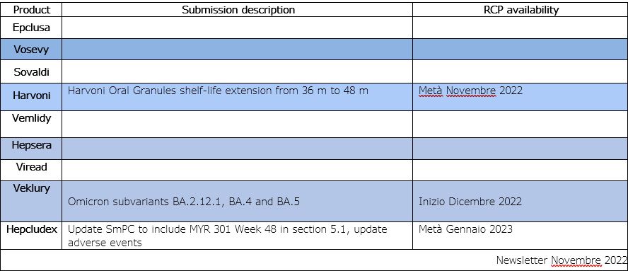 Nell’ottica di comunicare con regolarità le modifiche previste agli RCP dei nostri prodotti, e quindi di agevolare per quanto possibile la gestione di materiali promozionali/non promozionali, in relazione anche agli eventuali aggiornamenti necessari, vi inoltriamo la tabella in allegato relativa al mese di novembre 2022.